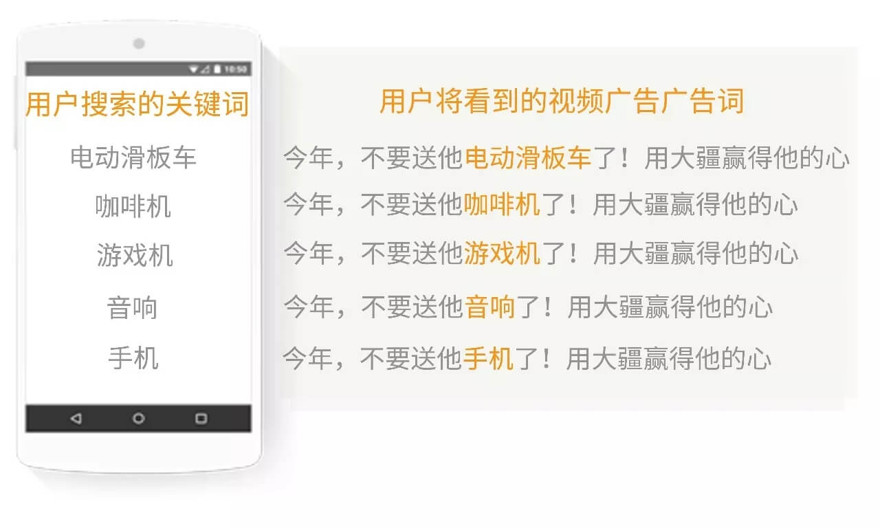 比如,当有人在YouTube上搜索PS4游戏机时,Google就已经记录下这部分人的行为,那么在他看YouTube视频时,就会在视频开始前看到“不要给他送游!戏!机!了!用大疆赢得他的心,看看他会有多惊喜吧。” 她仿佛能看到丈夫拿到一个大疆Mavic无人机时手舞足蹈的样子。对应的,还有“不要送咖啡机”“不要送健身器”“不要送耳机”版本的视频,都会有针对性地投放到搜索过这些词的消费者面前。