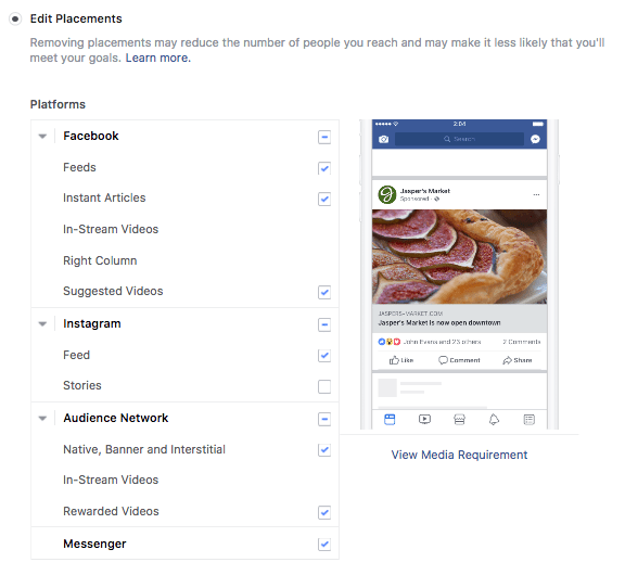 您还可以选择“修改展示位置”选项,然后移除您不喜欢的广告展示位置。但是,这会减少看到广告的人数,从而难以实现营销目标。