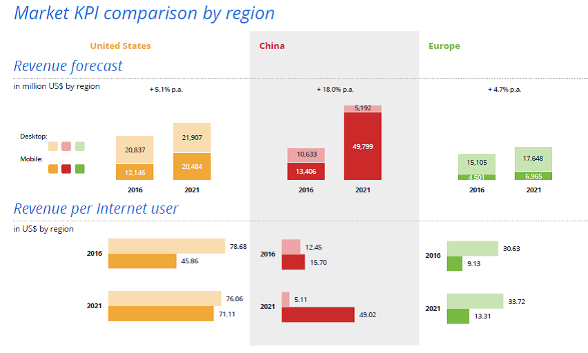 预计未来5年全球搜索广告复合年增长率在9.4%左右,到2021年搜索广告市场规模将达到1425亿美元。中国是增速最快的国家,未来5年复合年增长率在18%左右,到2021年中国搜索广告收入将接近549亿美元。未来5年美国搜索广告复合年增长率在5.1%左右,到2021年搜索广告收入将达到424亿美元,同时失去其全球最大搜索广告市场地位。未来5年欧洲搜索广告收入复合年增长率在4.7%左右,2021年搜索广告市场246亿美元。